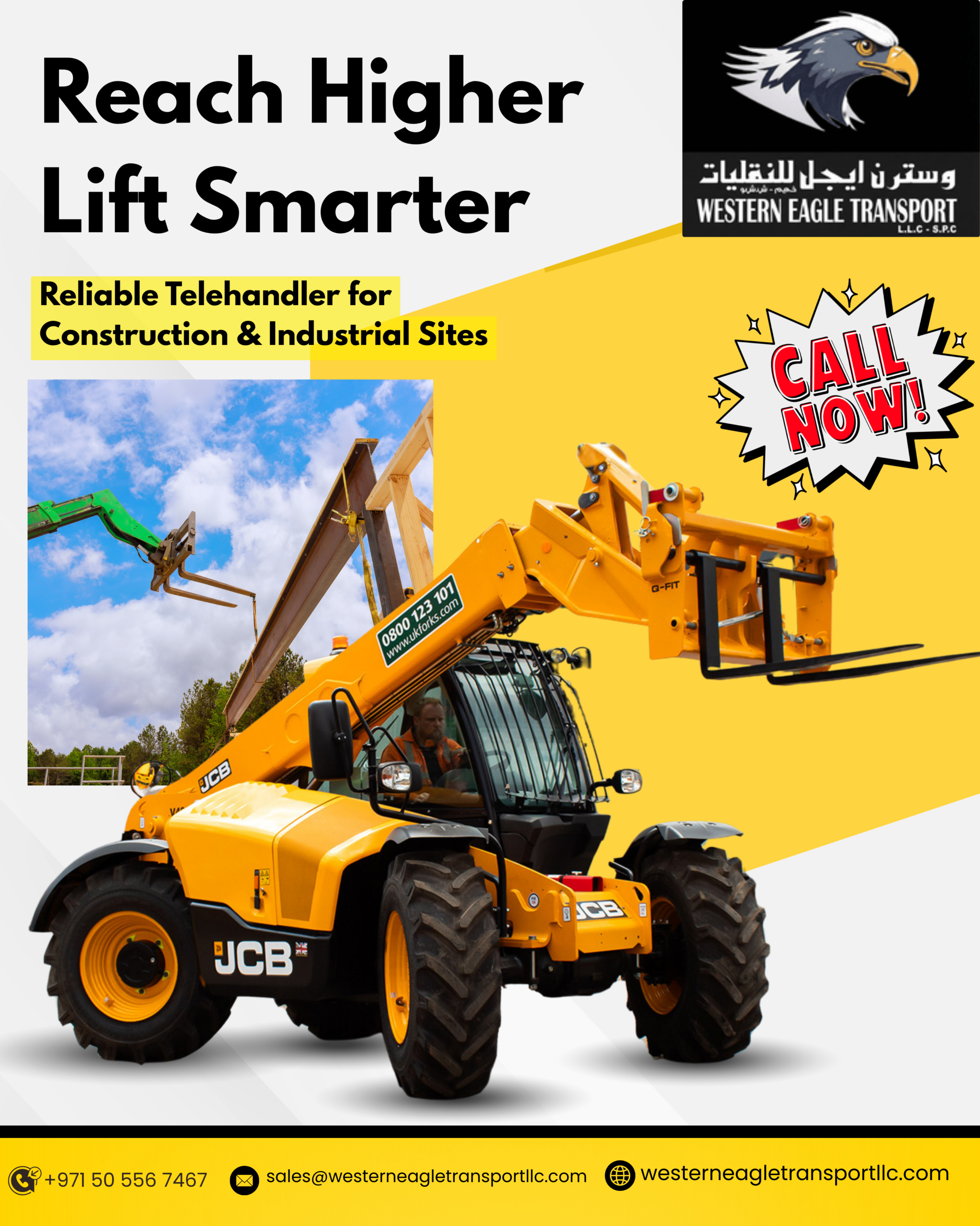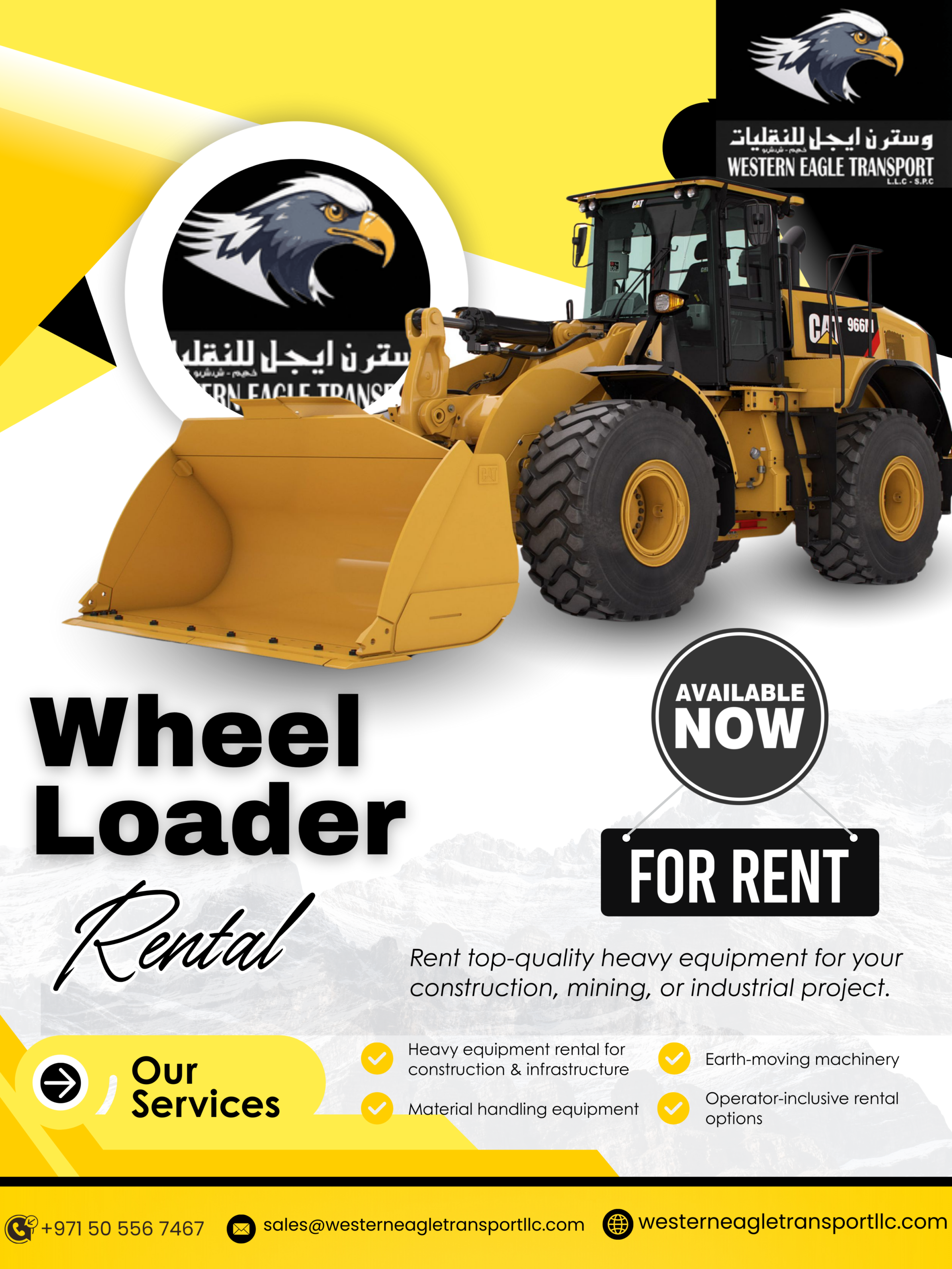 Western Eagle Transport Company is based in the Mussafah Industrial Area, Abu Dhabi. The company has one of the largest fleets of lifting equipment, including forklifts, telehandlers, cranes, and manlifts, for rent on a daily, weekly, or monthly basis. The company's motto is to serve the industry with passion and a professional approach, using state of-the-art technology and providing tailor-made services at competitive prices.